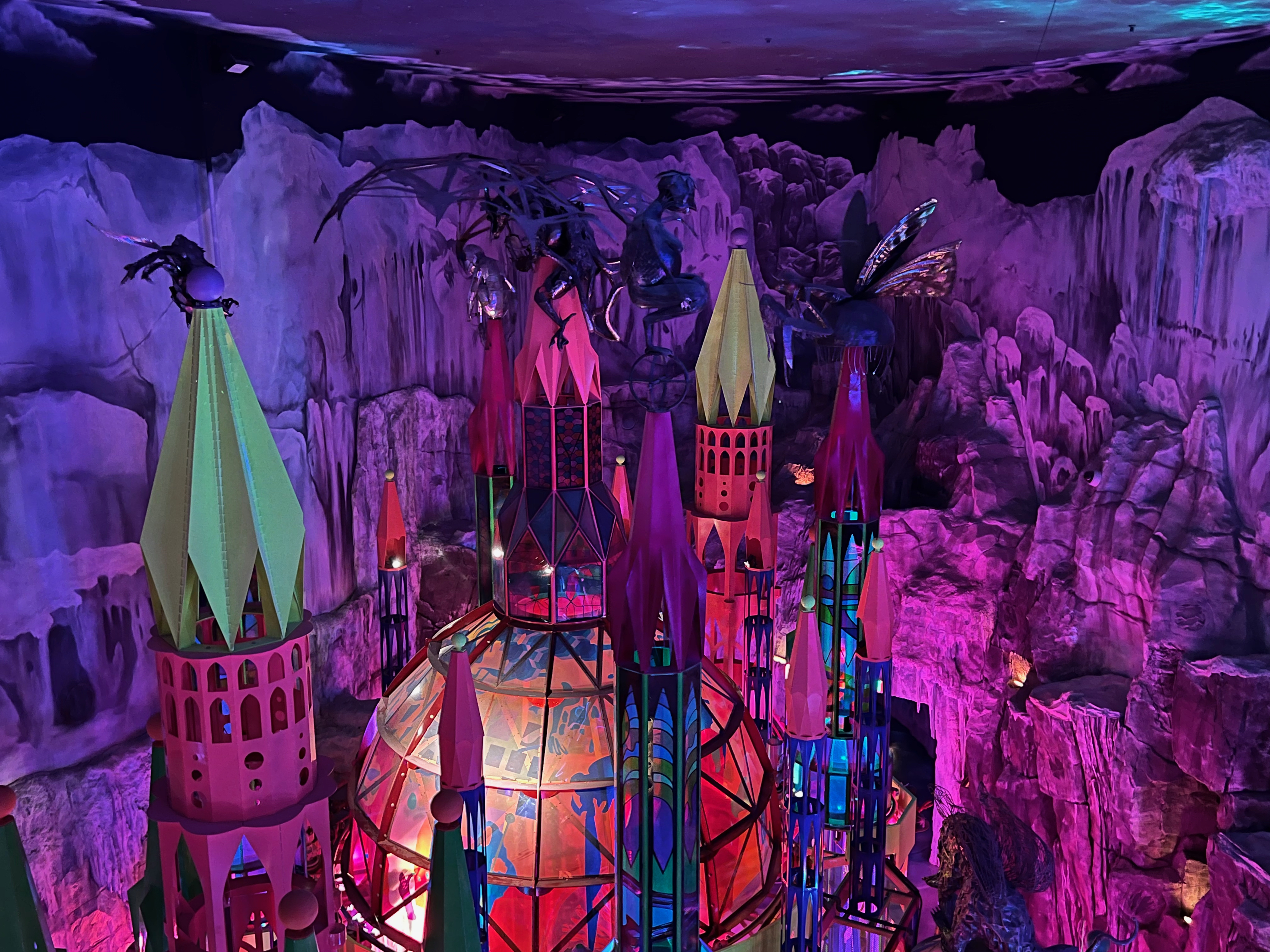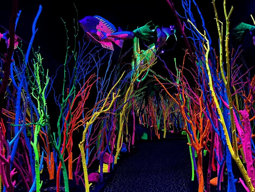 I love Meow Wolf because it feels like everything I longed for as a kid–a gigantic, fantastical funhouse full of secret passages and portals and wormholes to the next spot. One world is ethereal and melancholy, with a reclining mermaid tucked high on a ridge, her luminescent hair draping down the wall. Another looks like a futuristic street out of Blade Runner, with neon graffiti, an intergalactic bus, and a story about a rat antihero. The next looks like an ice planet with a show-stopping glass cathedral nearly touching the light show sky.