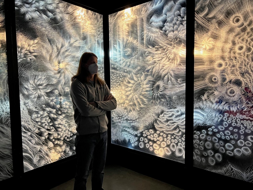 On Sunday morning, we arrive at the first of our Meow Wolf stops in Denver, Convergence Station. None of us have been here before. Kurt and I visited the original Meow Wolf in Santa Fe in 2019, and I loved the trippy art fever dream experience of it. The Denver installation is over three times bigger, located in an industrial area where the highways converge, lending inspiration to the intergalactic travel theme. The last real-world moment is when we are told of their mask policy (must stay on, fully covering one’s nose and mouth at all times, removing the mask even for a quick photo could result in being asked to leave). With our KN95s on tight, we enter the elevator and are whisked away to another world.