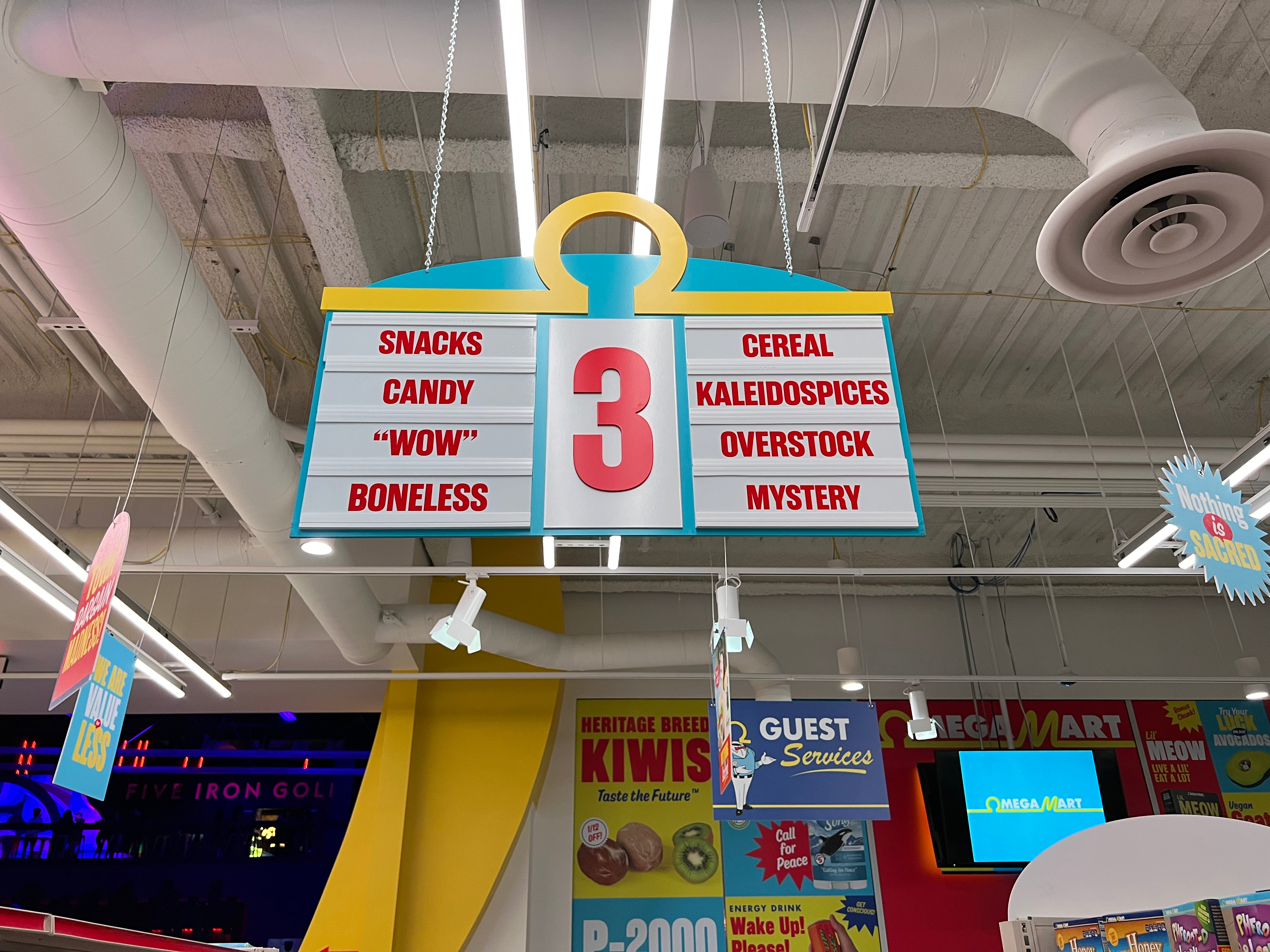 Similar to Denver, there is a (free) card you can pick up to play the interactive game, which unlocks pieces of the storyline. And occasionally the story breaks through to the public; while we shop around the grocery store, the lights cut out and the television monitors are taken over by a group of insurgents looking to take down DramCorp, the evil family-owned conglomerate within this universe.