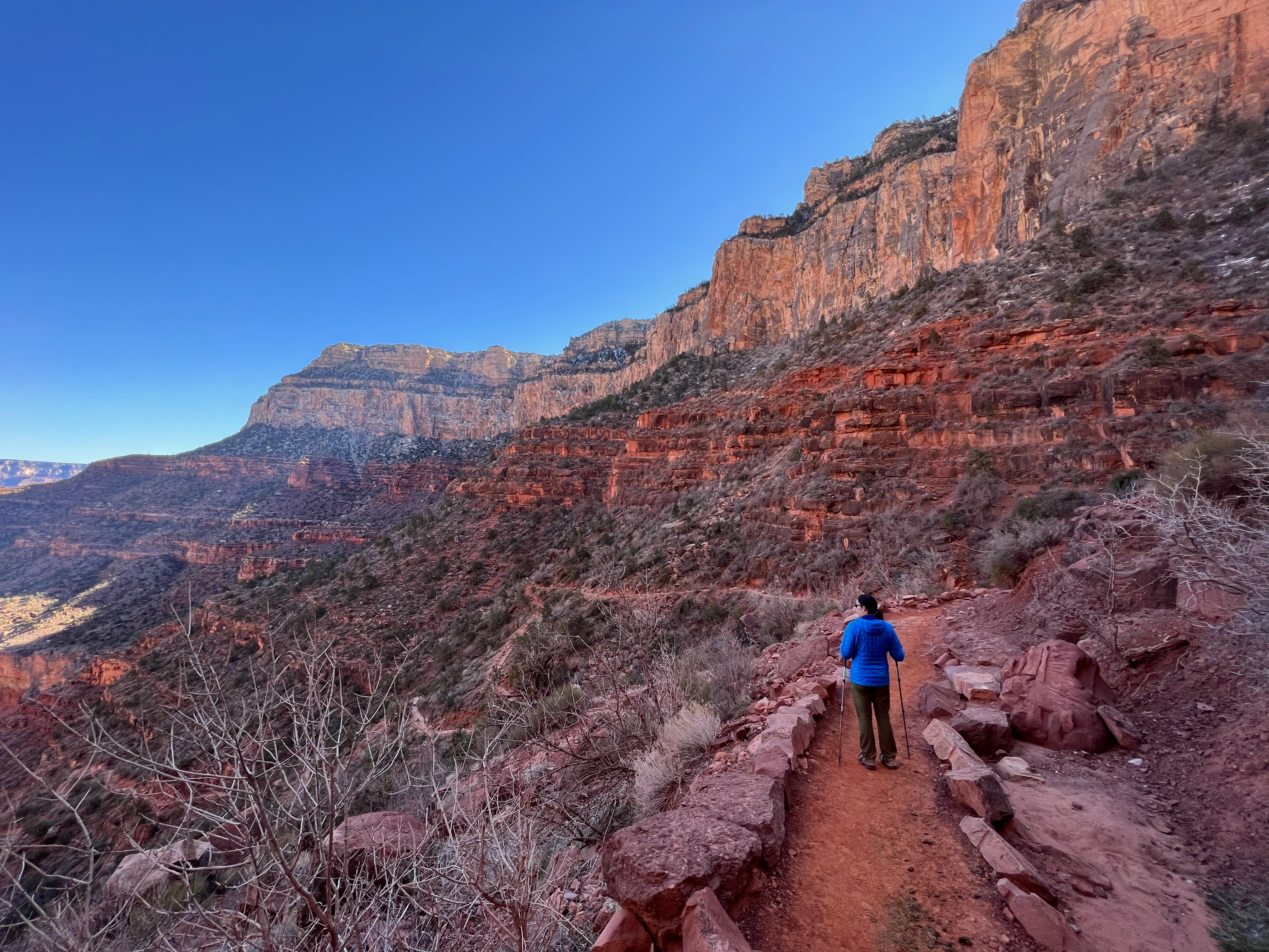 We descend slowly, one switchback at a time. I’m a slower hiker on the descent, thanks to my knee injury history, but my hiking buddies are relaxed and no big rush. As we get beneath the rim, the views are stunning. We are up close to the rock face and can see the layers of limestone, sandstone, and shale in detail. The first mile and a half or so are icy, but it’s manageable with my crampons and poles. I’m comfortable in my base layer and nano-puff in the cool 40-something-degree shade. My boots begin to expose red earth beneath the white snow, and soon we’re hiking on sun-dried dirt again.