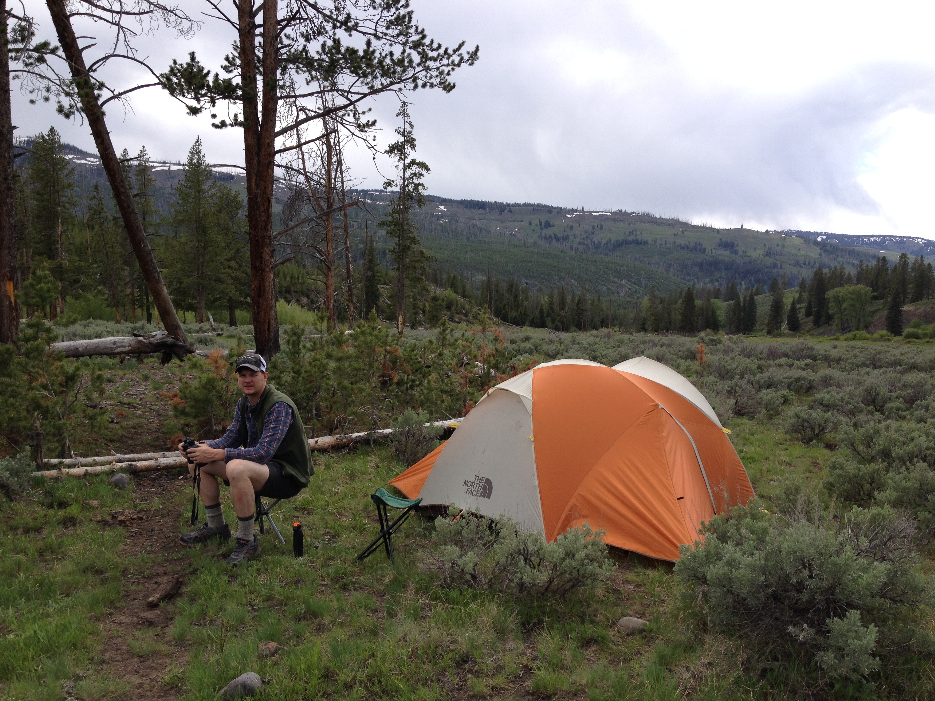 We enjoyed a few minutes of rest without heavy packs, then got to work setting up our campsite. After selecting a good spot to sleep 100 yards away from our cooking area, I set up the tent and laid out the sleeping bags while Kurt gathered fallen twigs and sticks to make a small fire. Our little site was in the middle of heaven, with mountains framing the gorgeous backdrop all around us. As sunset approached, mule deer wandered down the ridge or crossed the river near our site, which appeared to be a popular animal crossing. The bison weren’t done with us yet; a group of four walked up to our site, stopping about 30 yards away and gazing at us curiously. Two of them inspected our tent while one gave us a good lookover. Eventually, they continued on their way. As the sun set, we enjoyed a bota box of wine and scoured the horizon for more animals with our binoculars. When the sky was too dark, we strung up our food and supplies and went back to the tent to enjoy our first night’s sleep out in the true wilderness.