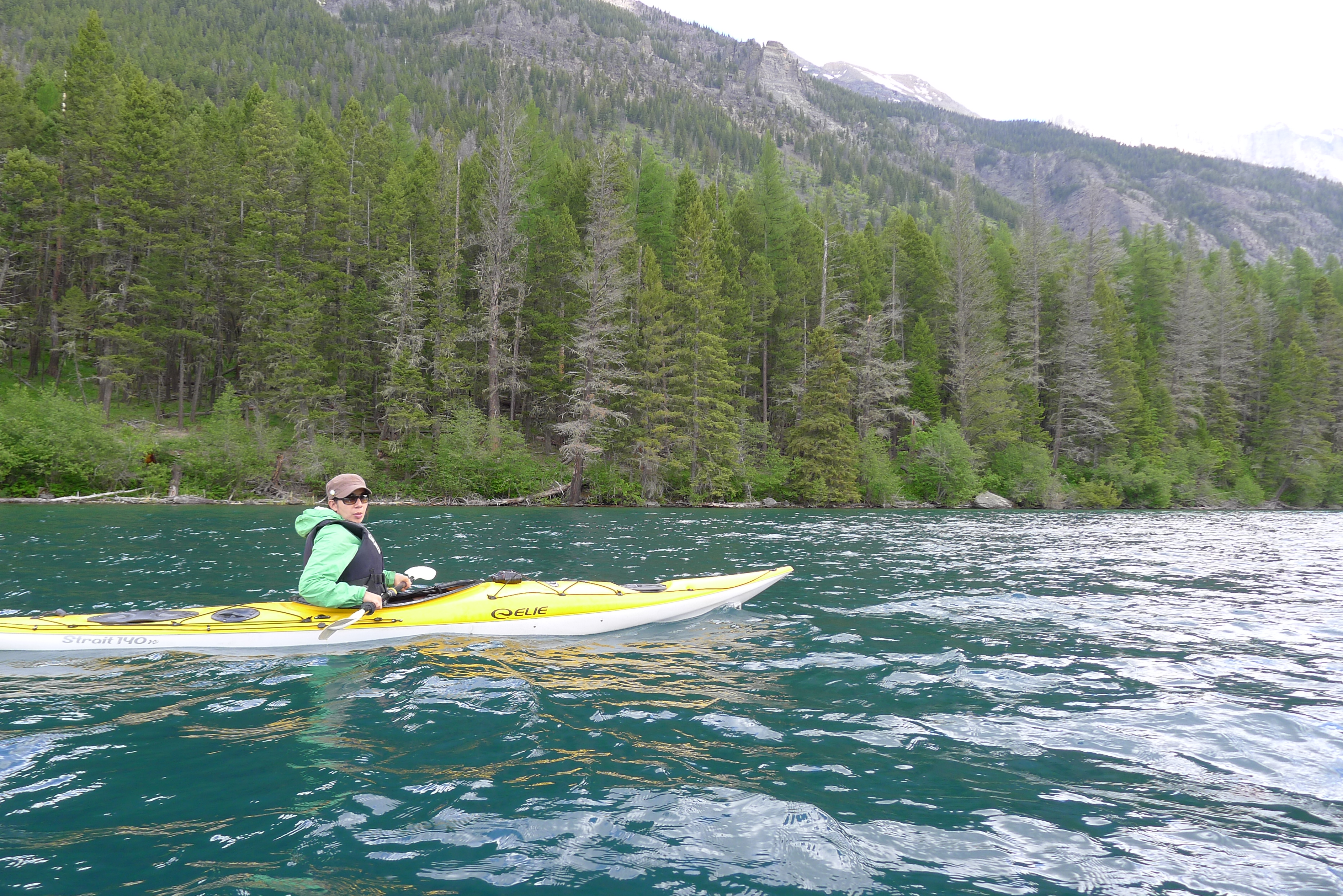 As Kurt secured the kayaks, we noticed a young mule deer grazing nearby. He saw us but didn’t startle. We continued about our business, getting out our daypacks and lunch, and he continued to hang around, keeping a safe distance while watching us curiously. I felt calmer with the deer nearby, thinking that that must mean there weren’t any bears around. Glacier has the highest concentration of grizzlies in the lower 48 states, a thought that was constantly on the back of my mind.