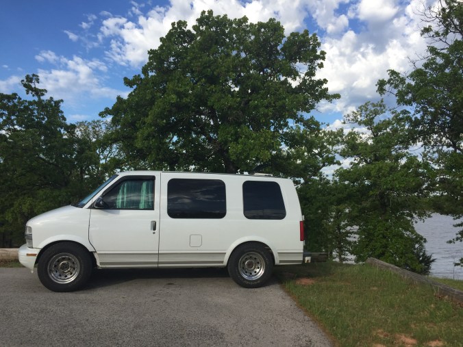 I wake up in the van, and lower the blind on the nearest window. Outside, the morning sunlight dances on the blue lake. It’s beautiful, and I am so happy to be here, surrounded by trees and water and expansive sky, on our new comfy foam van mattress next to my love. It’s my birthday!
