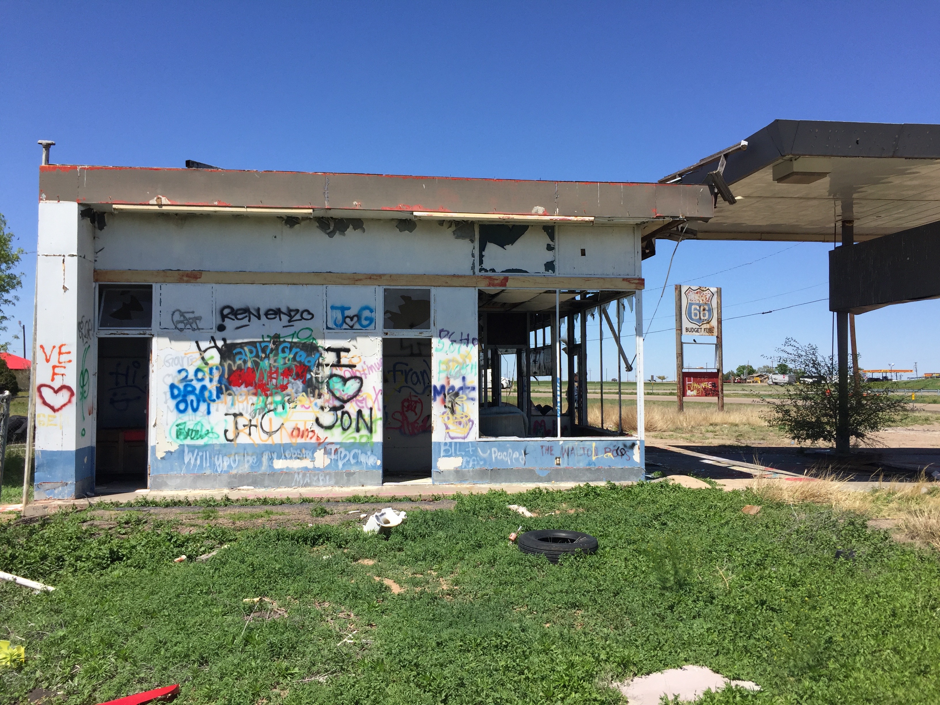 On this stretch of Route 66, we start hitting some of the kitschy landmarks that the road is known for: first, the “Leaning Tower” of Texas, then, the Slug Bug Ranch. A row of graffiti-covered VW Bugs jut into the ground outside of an abandoned building and gas station. Both structures are in ruins, their windowpanes smashed out, every surface covered in spray paint and empty bottles. We walk around, taking pictures and wondering about the story of these places. There’s going to be a lot of ghost towns on this road, many of which we marked with a pin on our Google map.