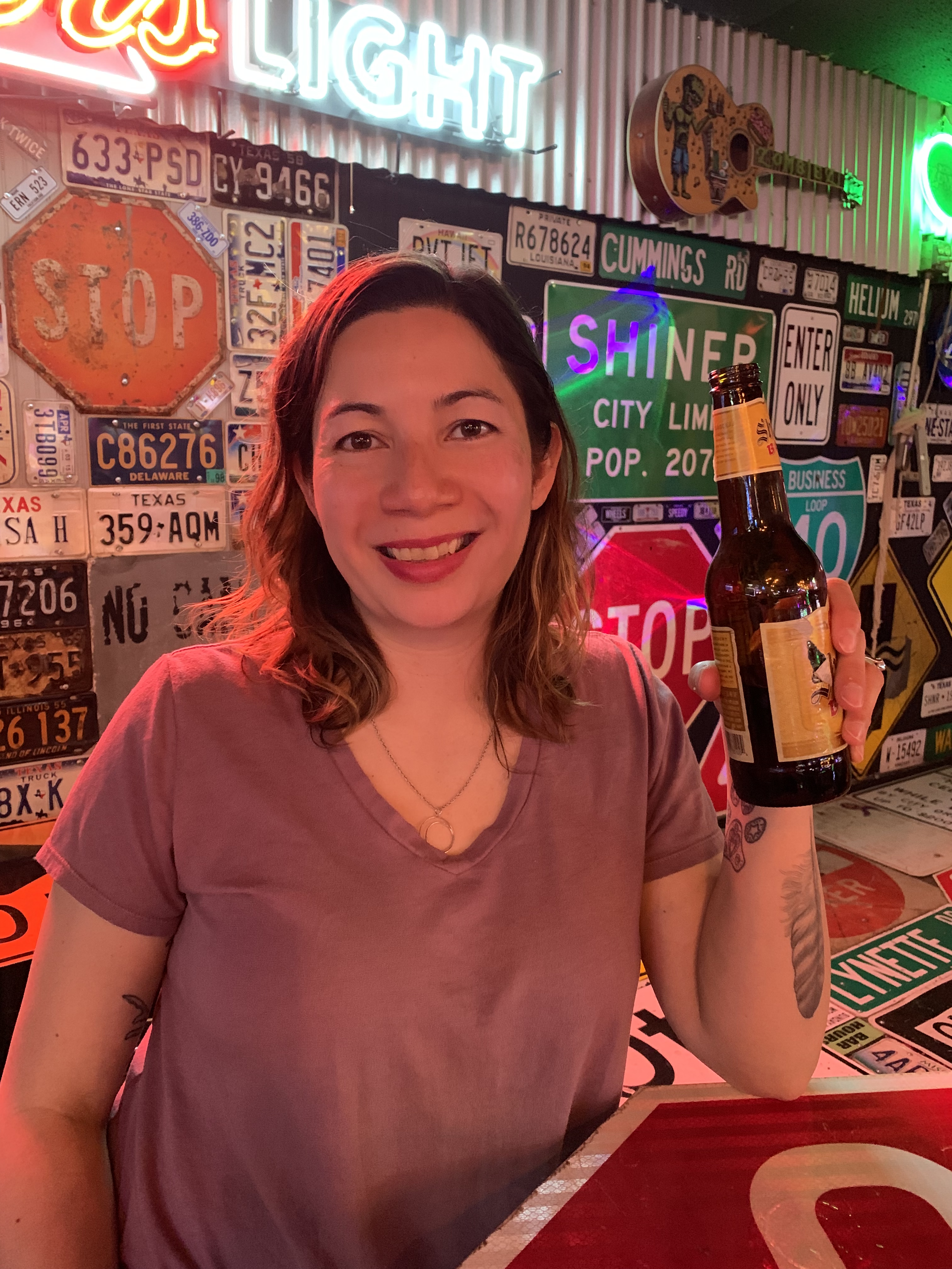 We cross into Texas, then check into an Airbnb in Amarillo. At a wine bar, I order my first birthday cocktail, something with prosecco and fruit and it is delicious. It is 80 degrees and sunny; back home in Chicago, it’s snowing. For the rest of the day, we celebrate Texas-style, with heaping plates of BBQ then rounds of Lone Stars in a zombie-themed bar. I try to take pictures of a chihuahua which arrived in its owner’s arms wearing pink goggles (doggles!) and a tiny pink helmet. Eventually, we go back to the Airbnb and sit outside on the covered second-floor balcony, watching heat lightning in the distance. The sky is so big out here.