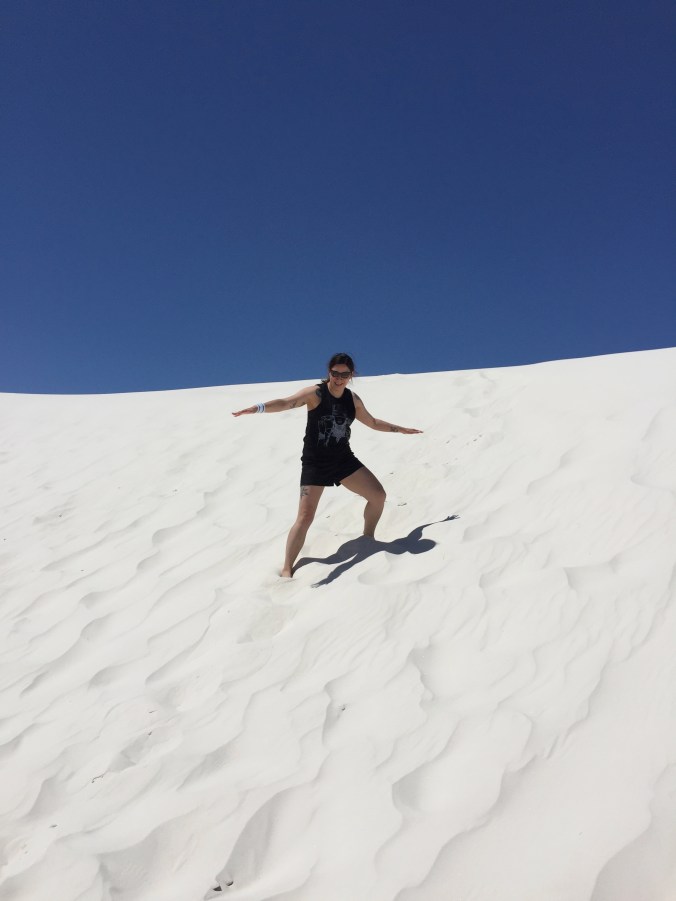You can see the gleaming white sand dunes in the distance as you approach the national monument. After we stop in the visitor center and pay our admission fees, we drive the van along the road that skims between waves of sand dunes. The white sand is gypsum, and it feels softer and silkier than regular beach sand. Kurt parks the van in a picnic area, and we get out and explore. White sand dunes sprawl in every direction around us. We take off our shoes and run up and down the dunes. There’s a school bus parked nearby, and a gaggle of kids running and laughing, using sleds to ride down the dunes. We head in another direction, up onto a higher dune far away from other visitors. The sky is clear and blue, and sun beats down at us and bounces off the white sand. On a day like this, you need to apply sunscreen on every inch of your body.
