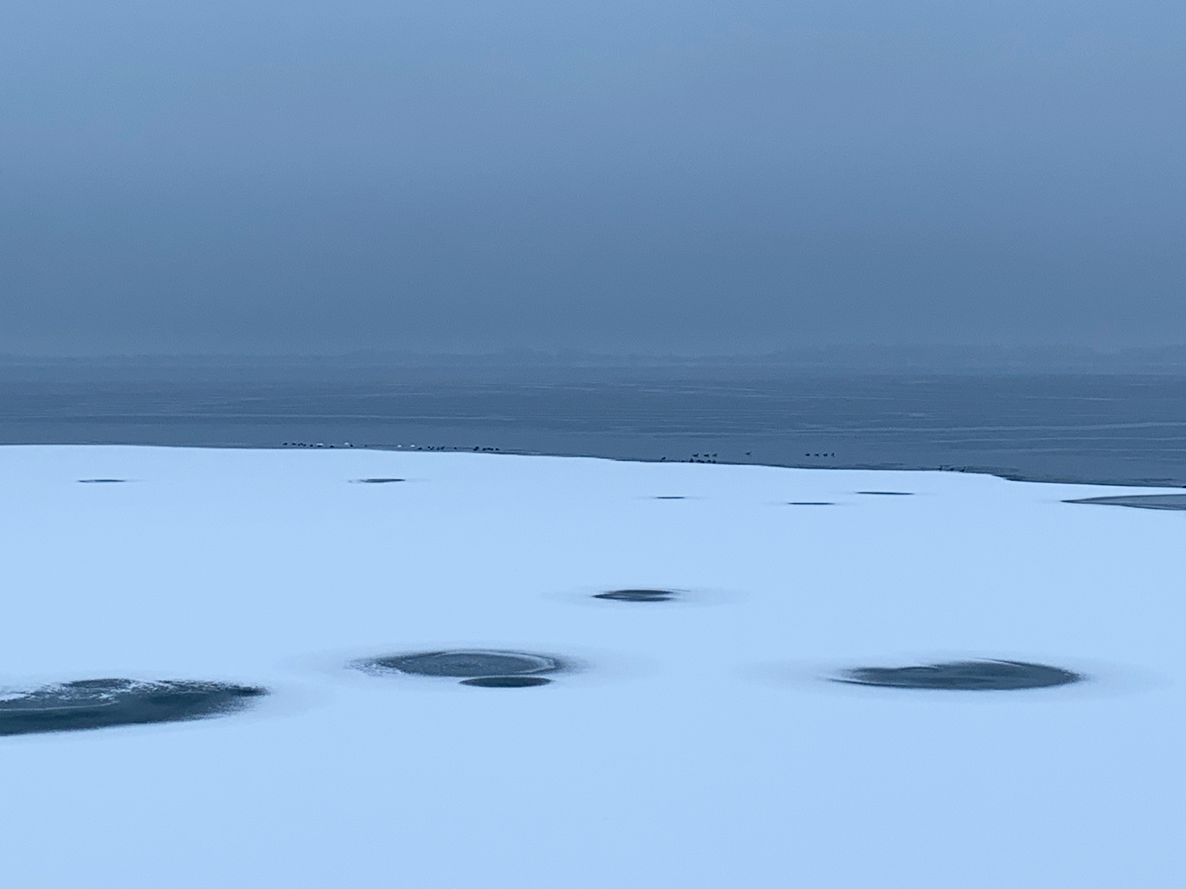A lake on a wintry day. The foreground is a snow-covered layer of ice over the water. In the background, the water is gray-blue, mirroring the sky. In the distance, a flock of geese float near the edge of ice.
