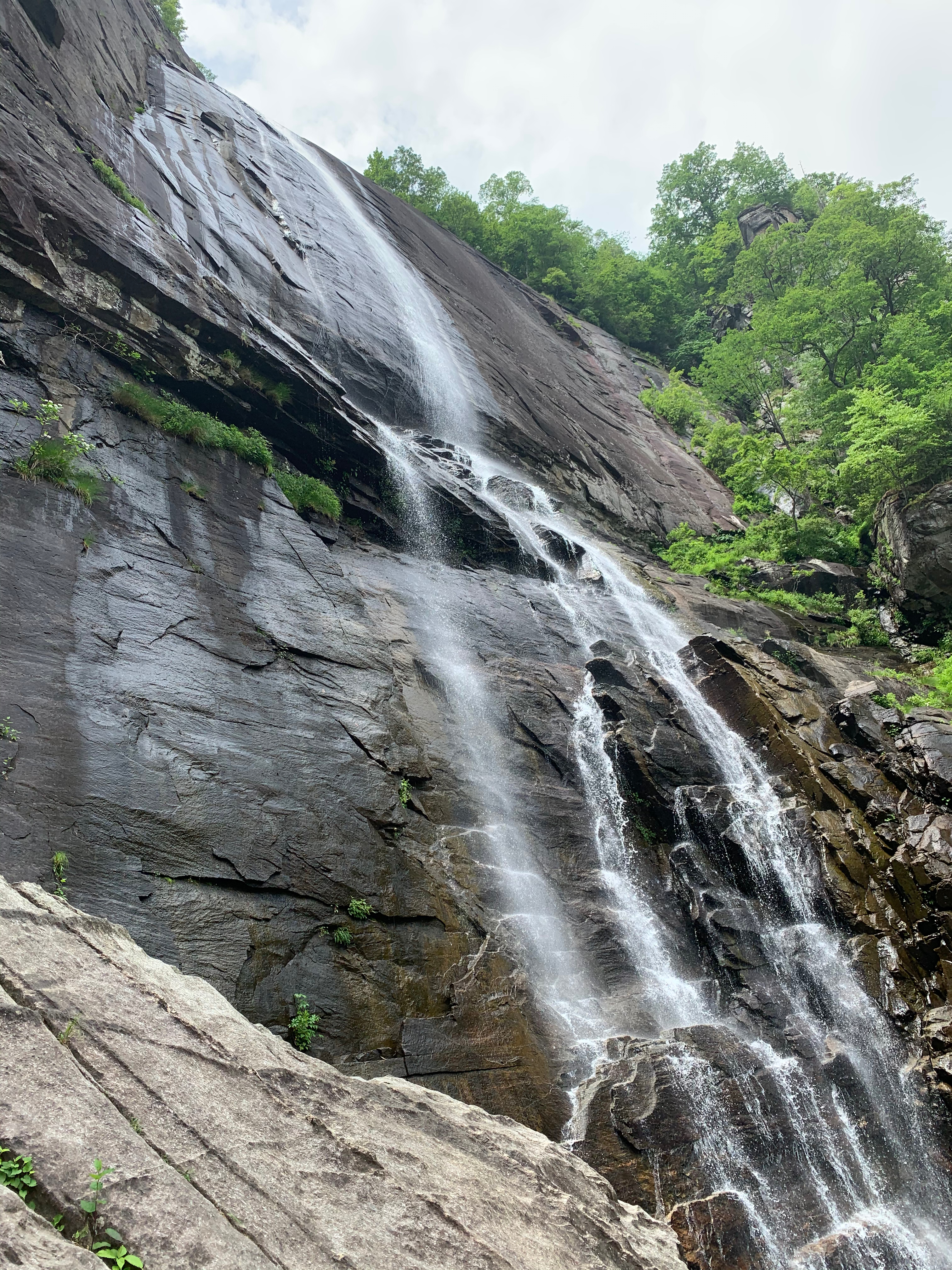 The online trail guide says you can either cross the falls and continue on the loop or turn back and come down the way you came. I’m in no mood for a scramble over wet rocks, so we turn around. Thankfully, the downhill trip is much easier for me than the uphill.