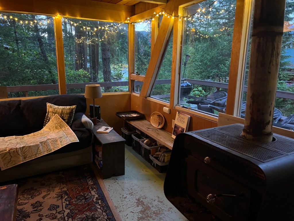 I wake up in our A-frame cabin in Packwood as the early sunlight streams into the loft sleeping area. Waking up in a real bed feels pretty great, and Kurt and I both have a pile of freshly cleaned and folded camping clothes sitting atop our bags, ready for the second half of our trip. The cabin is my dream house—rustic and cozy with a wooden deck overlooking a babbling stream. We’d sat outside the previous night eating carryout pizza and drinking canned white wine while our clothes tumbled clean in the washing machine.