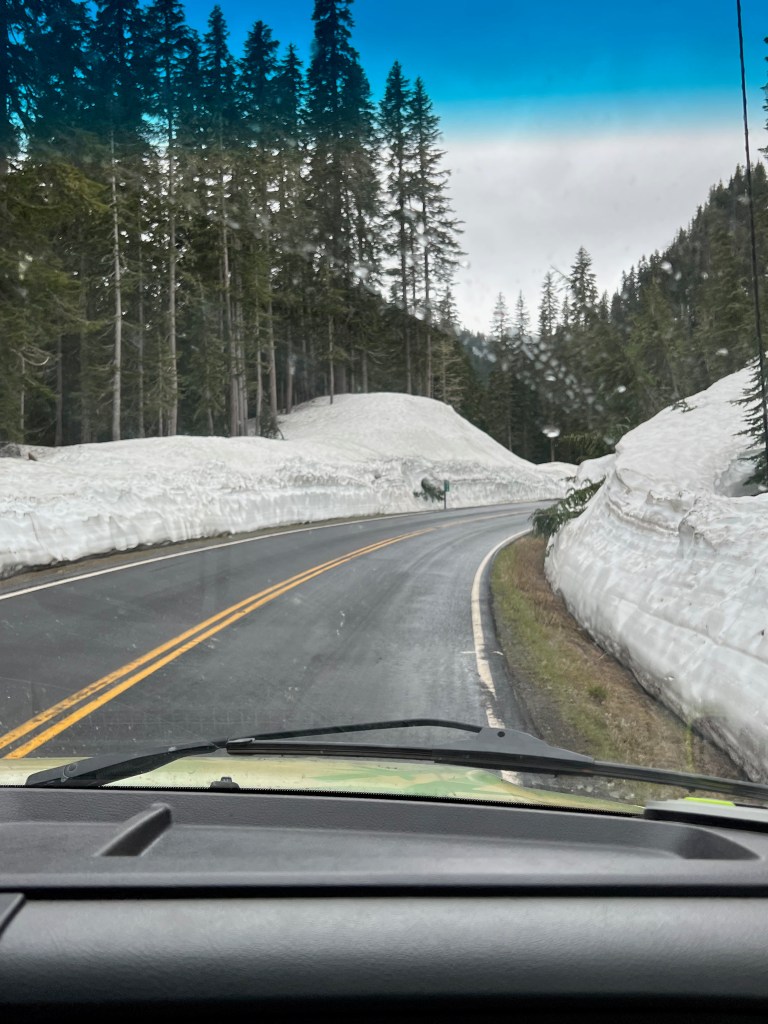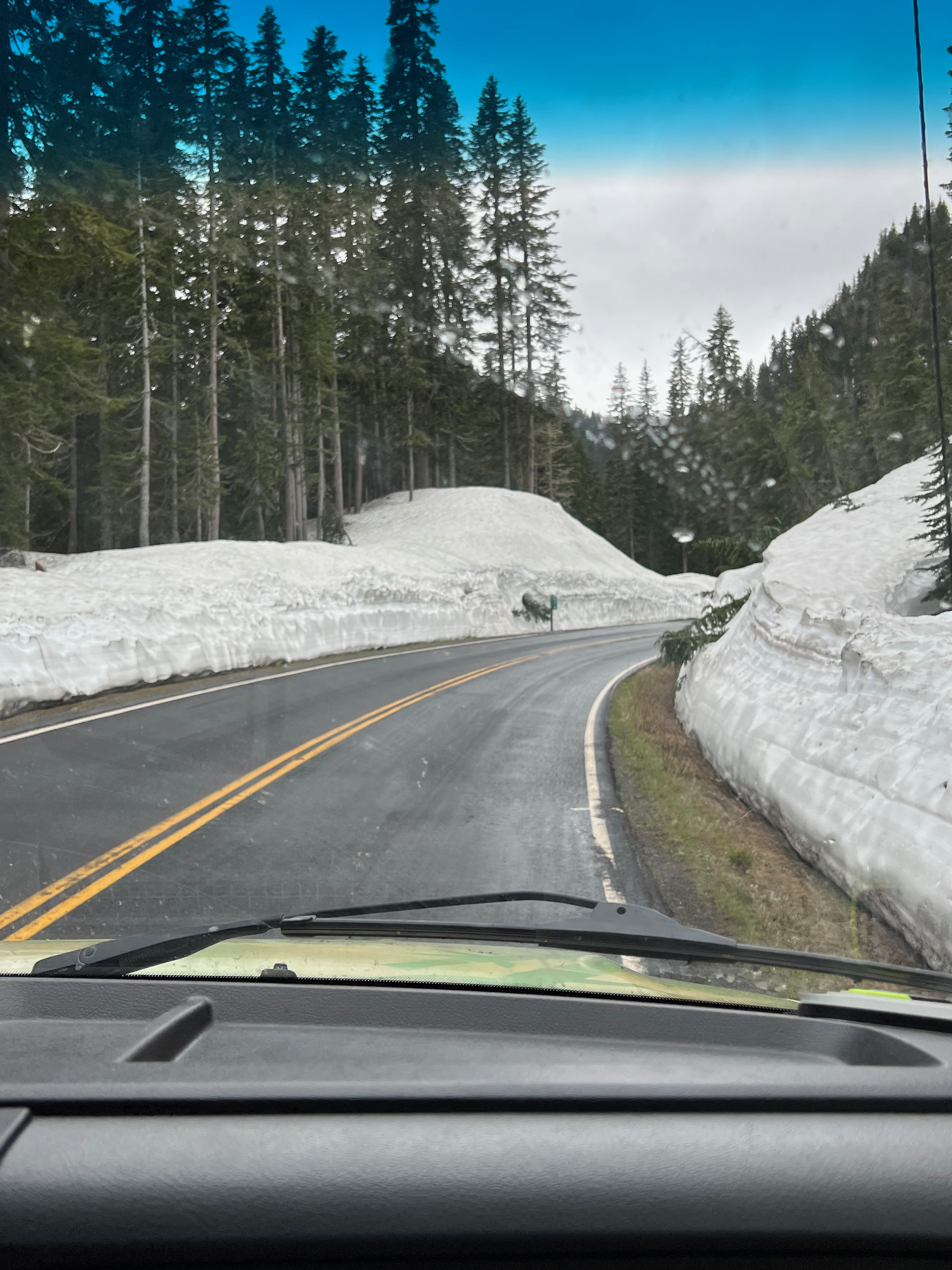 The road eventually deposits us on the north side of the park, not far from our reserved campsite. We pull over and check our phones for options. Kurt finds a recommendation for a good view of Mount Rainier, sixteen miles up a forestry road. I’m antsy to do something so I say yes, but once we’ve begun rambling our way up the potholed, washboard-riddled gravel road, my anxiety spikes. I get pretty extreme acrophobia on any steep trails or roads with sheer drop-offs (see my previous blogs from the Smoky Mountains, Iceland, the Grand Canyon, Alaska, Montana, New Mexico, basically everywhere). We’re a few miles from the top when we come around a corner and see that the road ahead is covered with snow for the remainder of the way. At this point, I pretty much have a panic attack and ask Kurt to take us back down. He has to turn the van around carefully on the narrow road while I squeeze my eyes shut.
