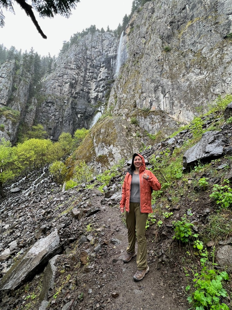 We’ve barely gotten into the forest before we spot a big cat poo; there are signs warning of cougars in the area. So that’s exciting. The trail starts heading uphill pretty quickly, giving us a view of the forest floor. The ground is wet but thankfully not slippery, as the trail is on the narrow side, hugging the side of the ridge. I start feeling not great—lightheaded, tired. We stand in the middle of the trail as I chow down two chocolate almond butter bars and a bottle of water. I focus on breathing. After a few minutes, I tell Kurt I’m OK to keep going. The trail continues to climb via switchback, and I take a few more breaks to catch my breath. Finally, we can hear the sound of water. The initial view of Snoquera Falls after coming around the rocky corner is pretty stunning. There’s also an incredible outward-facing view of the mountains through the mist. I’m relieved to have made it.