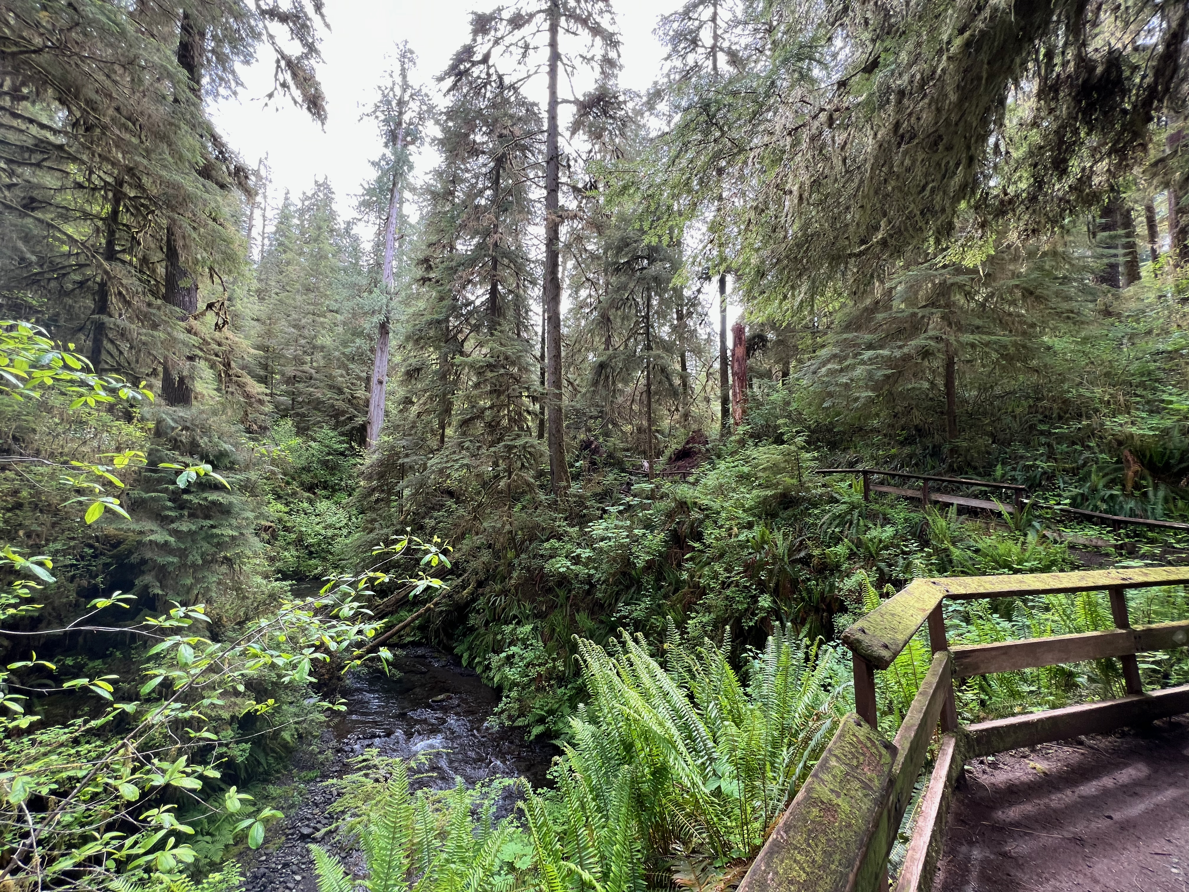 The morning is drizzly with rain, surprise. We make breakfast at camp, then head to the Rain Forest Nature trail right by our site, a short 0.5-mile trail along Willaby Creek. I hadn’t looked up anything about the trail and am blown away by the view of the Gorge and the old-growth forest flanking it on both sides. It feels like we’ve stepped into an ancient world and I almost expect a pterodactyl to swoop through the sky. The trail winds along high above creek level with a wooden railing hugging you to the side of the mountain, and I’ll continue my habit of making hyper-specific Chicagoland references by saying that it made me think of Tropic World Asia at Brookfield Zoo. Even more surprisingly, we barely see anyone else out on the trail, a stark difference from the packed parking lot at Hoh the previous day. Since the trail is so short, we join the Quinault River Trail for a bit to get a little more time in at this beautiful spot.