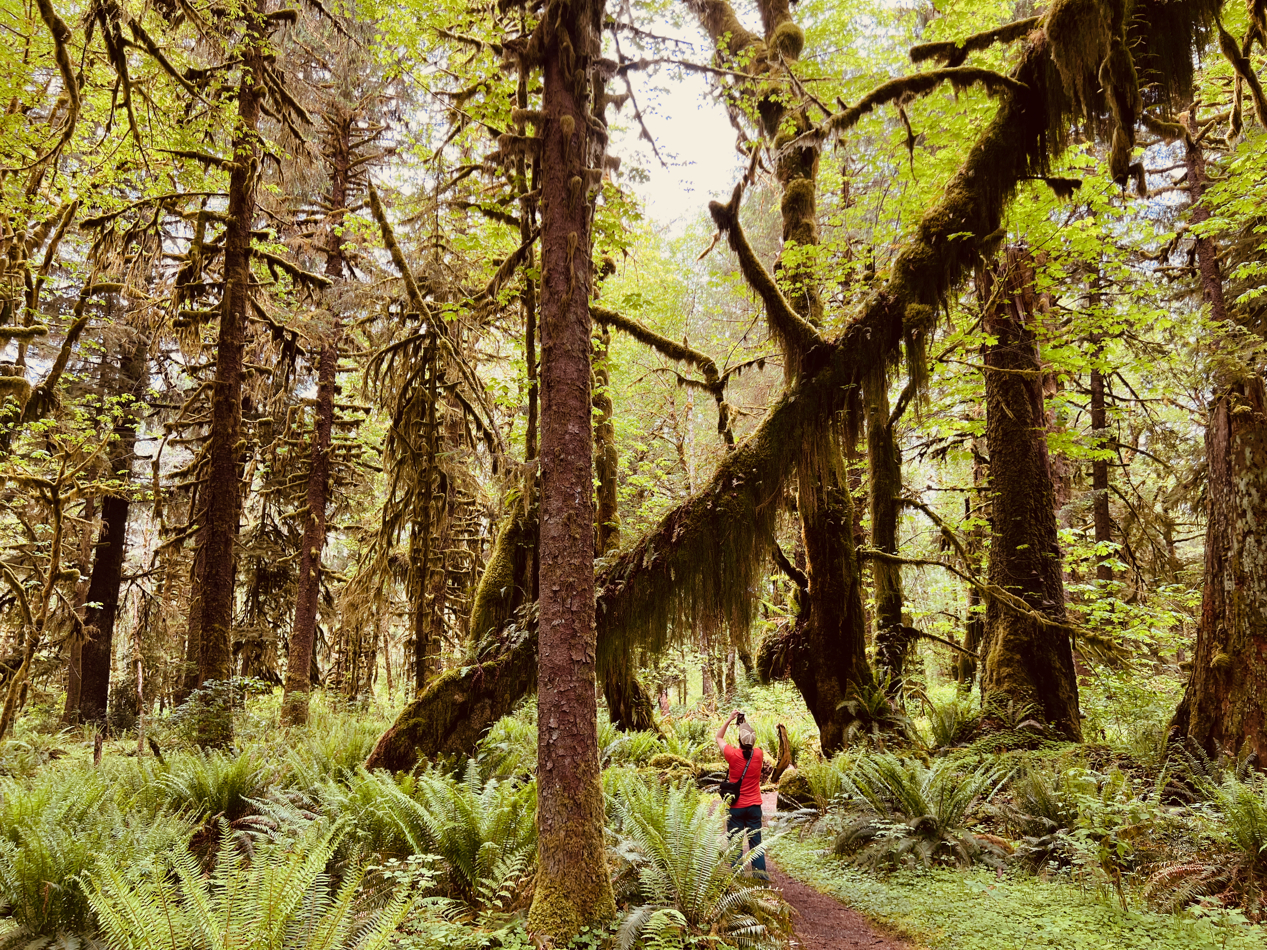 Kurt and I both love a scenic drive, so we embark on the Quinault Rain Forest Loop, a 31-mile route around the entire lake. It takes about 2 hours to complete due to gravel roads and stopping to see all the waterfalls. It is also popular with bicyclists, and we see quite a few out and about. Kurt and I make a few stops at trailheads to stretch our legs on some easy hikes, including the Maple Glade Trail, which ends up being one of Kurt’s favorites. The mile-long trail takes us through a grove of ancient towering maples; I am in awe of trees and their resilience to survive centuries of extreme elements. I’ve always felt that nature is more than a little but supernatural.