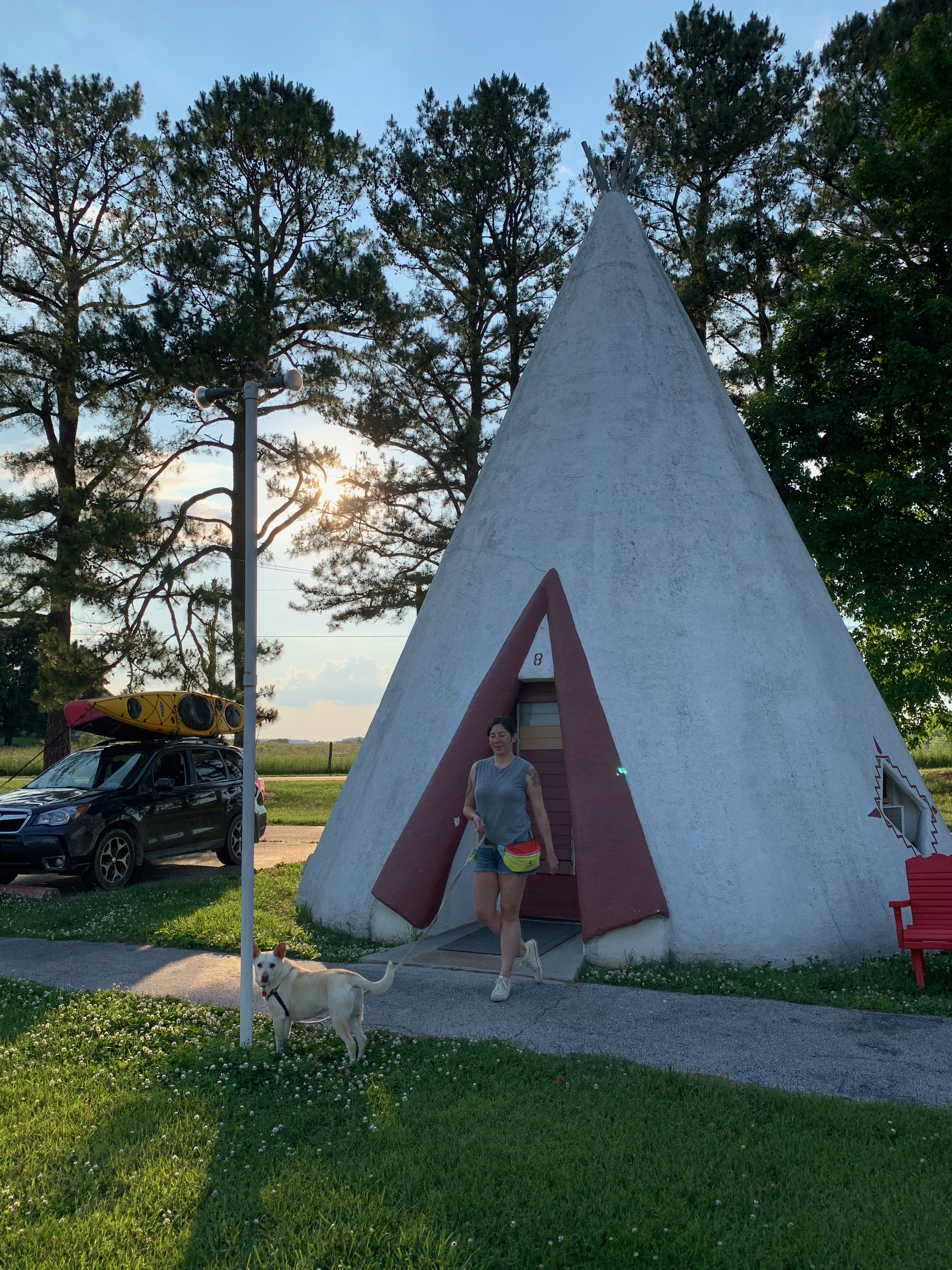 With sunset approaching, it was time to make a decision. I could tell Kurt preferred the campground over a chain hotel, but was willing to go with the Holiday Inn to make me happy. This put me into decision paralysis and I couldn’t bring myself to click the booking button on the app on my phone. “Maybe we’ll find something here,” Kurt said, suddenly optimistic as we reached the heart of Cave City and started spotting motels along the highway. All of a sudden, we spotted a semi-circle of teepee-shaped structures with a big neon sign in front. It was a classic motel right out of the last midcentury, reminiscent of old Route 66.
