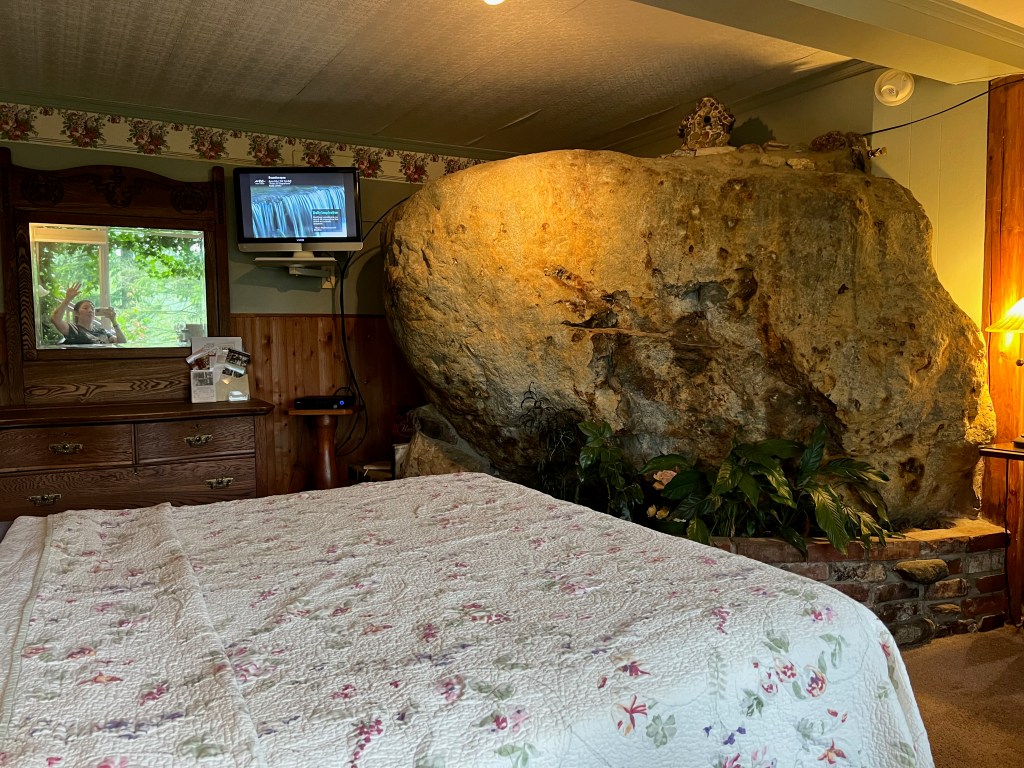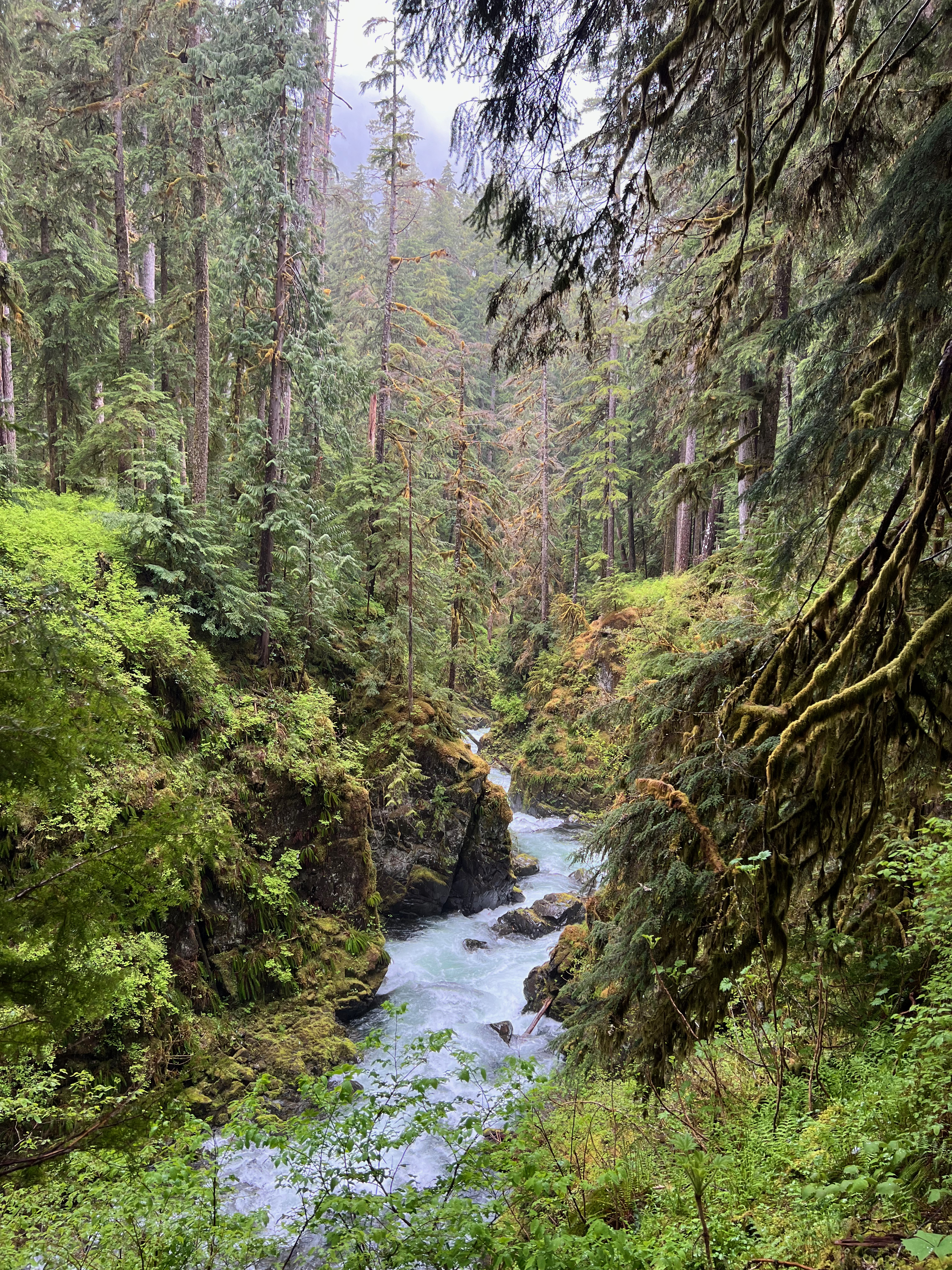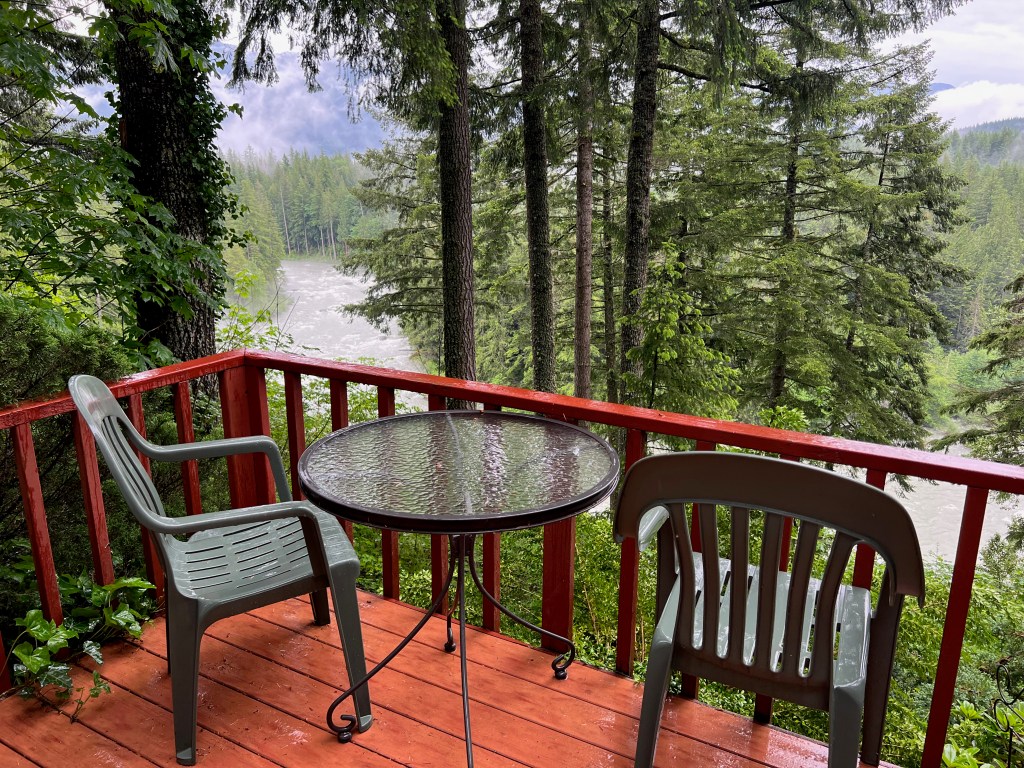 We are staying at a bed&breakfast in Snoqualmie for the night, and our room overlooks the river with a view of the forest and mountains. Also, there’s a gigantic boulder in our room, which feels appropriately Twin Peaksian (also doesn’t hurt that behind the boulder we have a private sauna room).