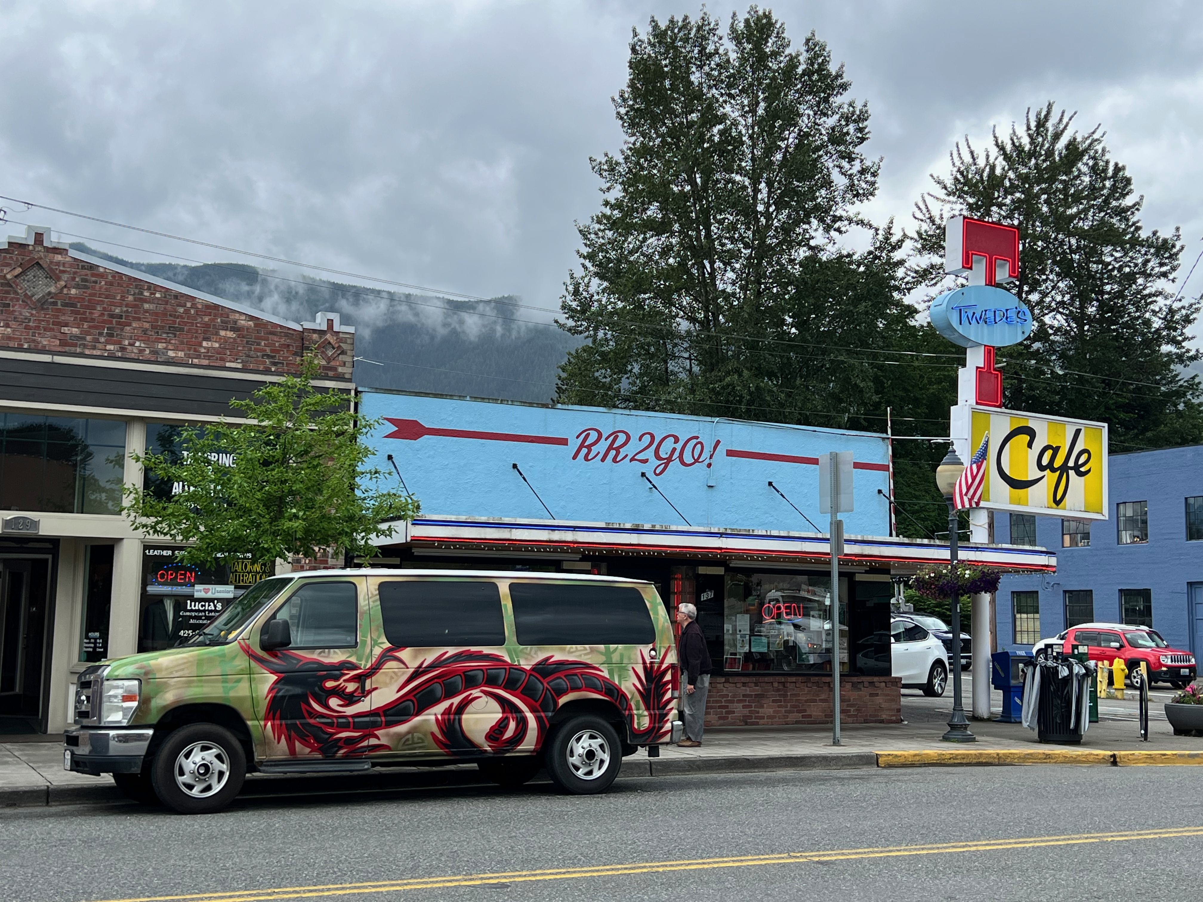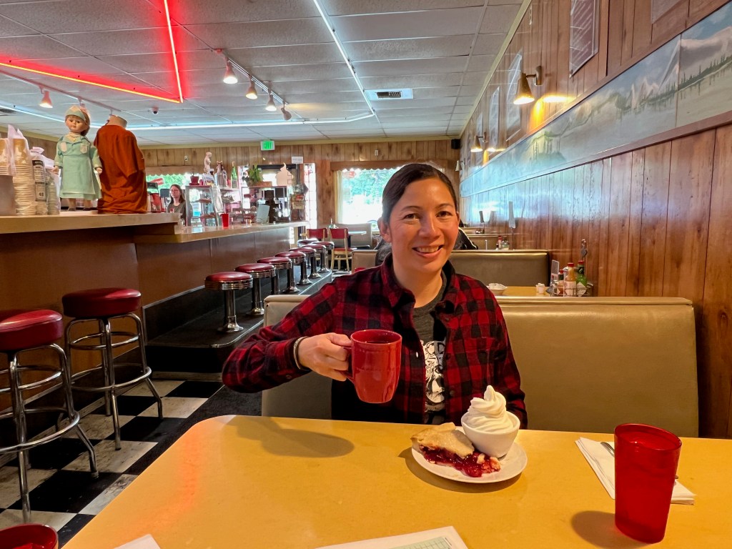 With our first mission accomplished, we leave Enumclaw and drive for an hour towards Snoqualmie. I’m extremely excited for this part of our trip because I’ve been a massive fan of the David Lynch/Mark Frost-created TV show Twin Peaks since it first aired (I was in sixth grade and didn’t really know what I was watching but I was intrigued. I later binge-watched the series on VHS in high school, and multiple times since). First thing first, we go to Twede’s Diner (a.ka. The Double R) so I can order a damn fine cup of coffee, black as midnight on a moonless night, with a slice of cherry pie.