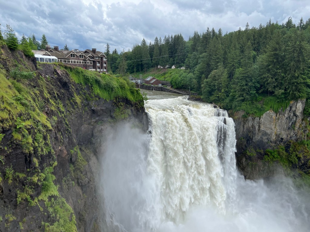 I have an internet-gleaned list of filming locations on my to-do list, so one by one, we check them off. Ronette’s bridge, check. The Twin Peaks Sheriff’s Station, now a rally driving school with a view of the Packard Sawmill, check. (The incredibly nice woman at the front entrance even let me sit at Lucy’s desk for a photo.) The Salish Lodge & Spa (a.k.a. The Great Northern Hotel) and Snoqualmie Falls, check. Oh Diane, I almost forgot, got to find out what kind of trees these are! They’re really something.
