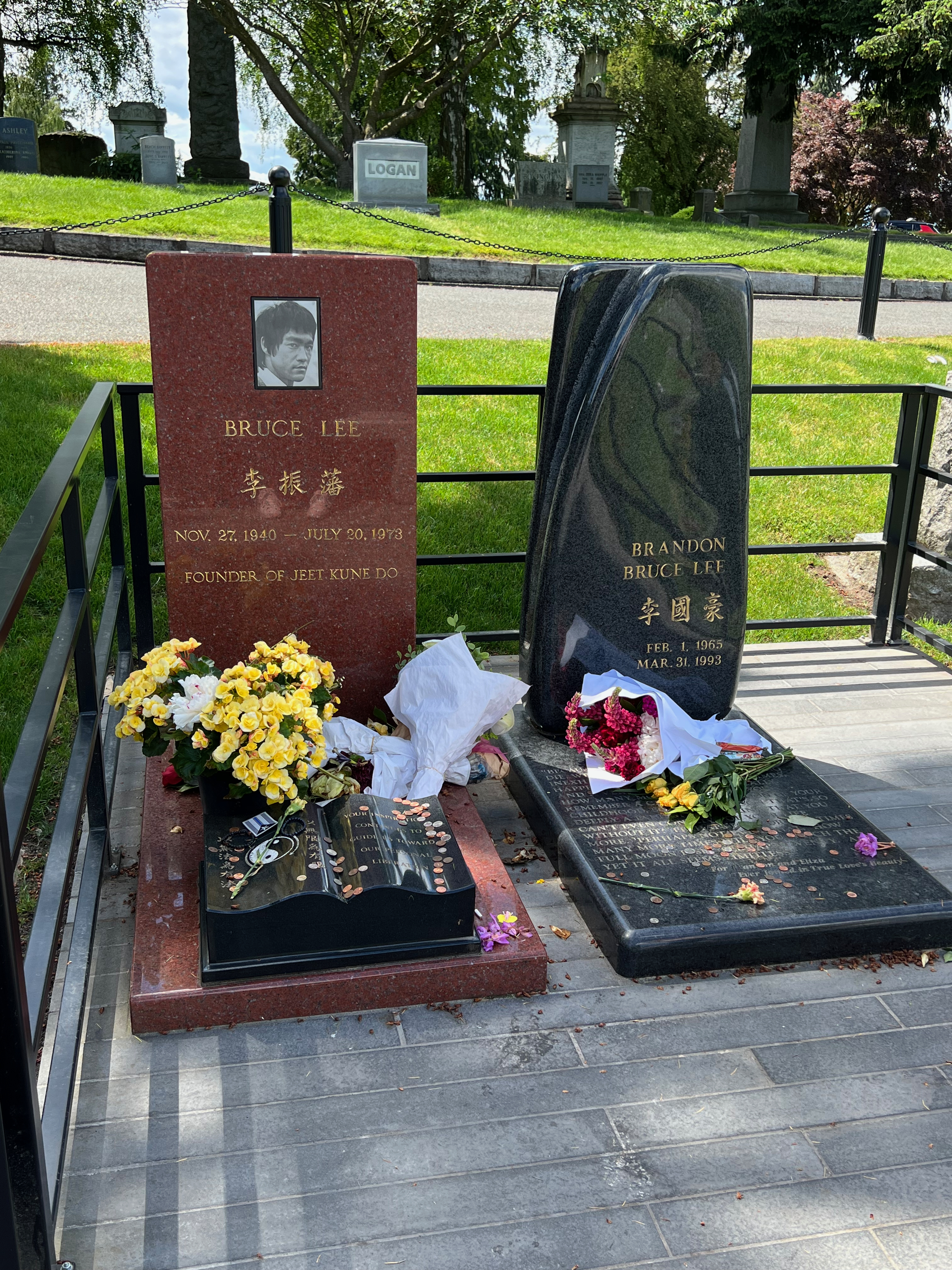 The first task of the day is to return the van to the rental place. Goodbye, Kung Fu, you were a fantastic home for the past week. We take a Lyft to the Capitol Hill area of Seattle and drop our stuff off at our final Airbnb. I have one more pilgrimage I want to make; I want to visit the graves of Bruce Lee and Brandon Lee at Lake View Cemetery in the nearby-ish Volunteer Park. It’s gotten quite warm out, and I begin to get tired, sweaty, and grumpy. I kinda forgot until now that it’s summer. Whose idea was this? (Mine). Maybe we should quit (I shouldn’t quit, we’re almost there). My feet hurt and my back is sweaty. I’ve had a weird time managing my moods ever since I had covid. We reach the cemetery entrance and notice a steady stream of people headed in the same direction. The small crowd grows quiet and respectfully somber. From what I’ve read, Bruce Lee’s family chose Seattle as his resting place because it’s where he fell in love and spent the happiest years of his life. It’s moving to see and experience with strangers and fellow fans. I’m glad I didn’t give up just because my feet hurt.