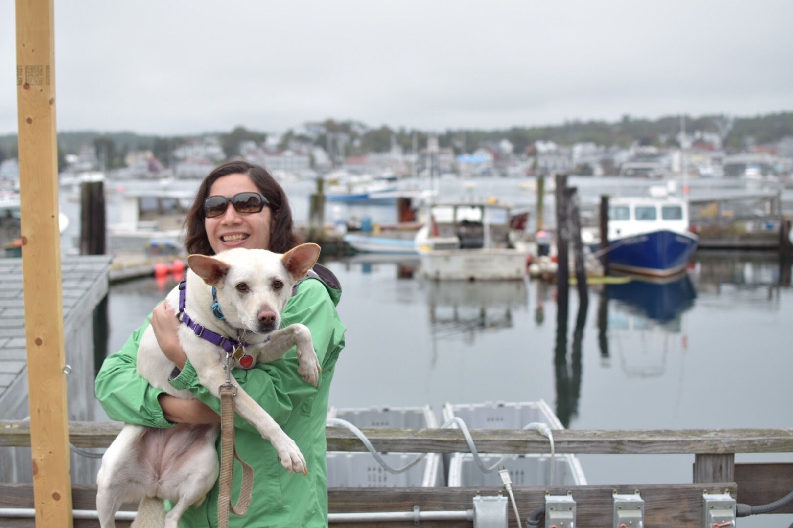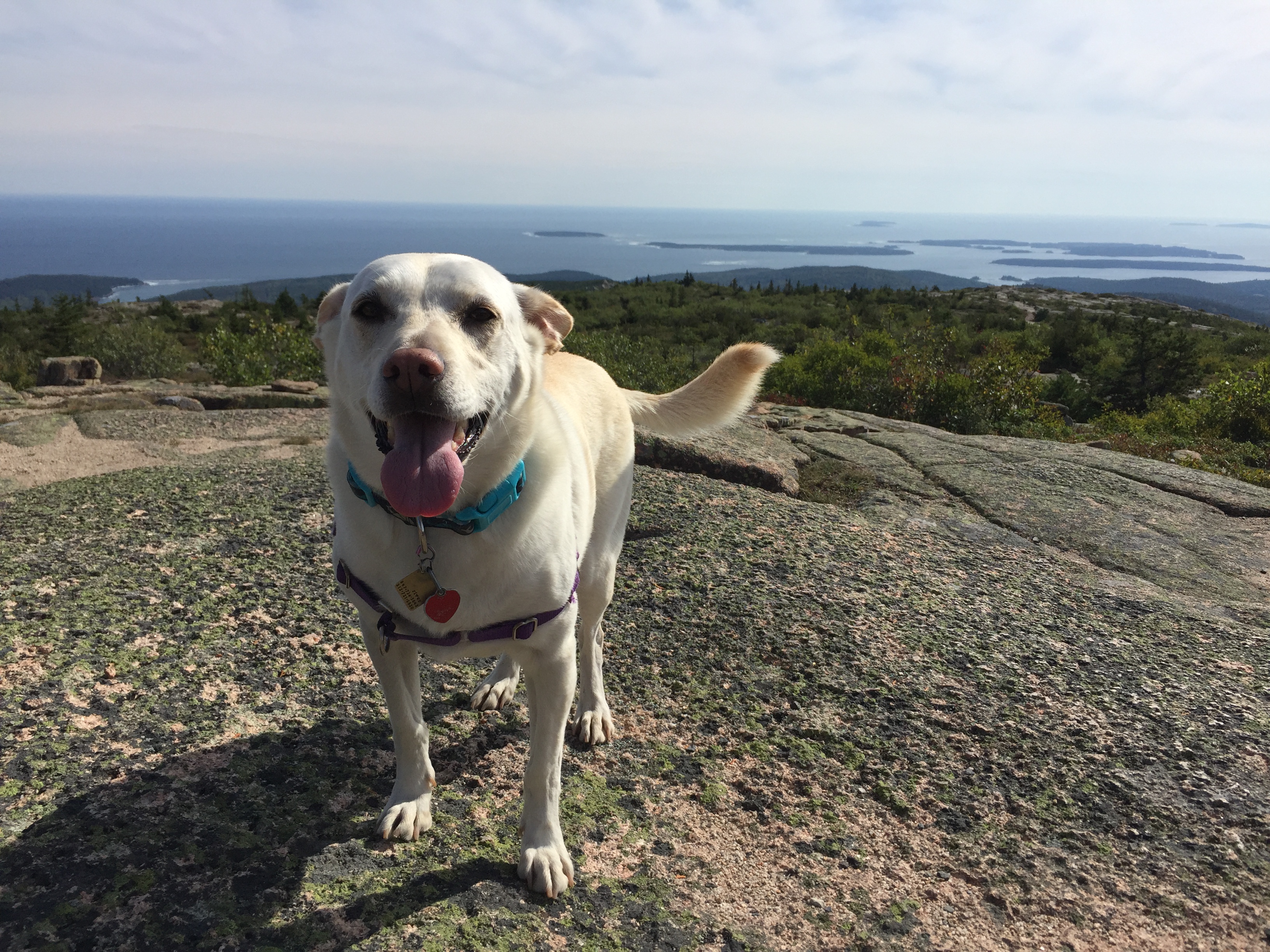 We spent the morning in Bar Harbor, eating breakfast in the dog-friendly patio area of That Way Cafe. As the sky cleared up, we drove back into the park for an easy first hike, going 3.2 miles around Jordan Pond and getting a nice view of North and South Bubble Mountains. The first half of the trail was an easy dirt path, but coming around the other side of the pond (which is actually a 150-feet-deep lake), the trail traveled over large rocks and boulders, and included a series of planks lifted off the ground to protect vegetation. River scrambled easily over the rocks but it was a little tricky to keep her on the planks when she would rather jump onto the forest floor. That night, we drove back to Bar Harbor (we did lots of back-and-forth between the town and the campground since it was only 6 miles away) and had a lobster dinner–my first! River snoozed under the table as I learned how crack the shell and slurp out all the inner buttery goodness. She *might* have been given a little sample so she could brag about it upon her return to the dog park back home.