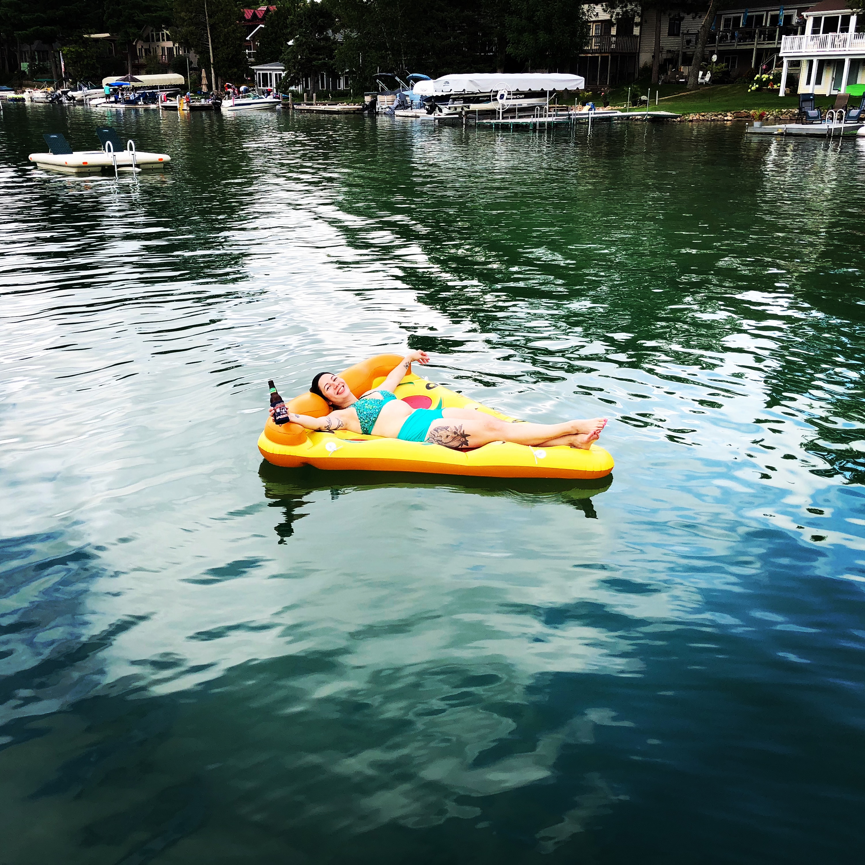 This year, I took along a waterproof speaker and attached it the front of my kayak with bungee cords so I could listen to a mix of pop, indie rock, and 70’s AM Gold while paddling. I’d tuck a New Glarus Spotted Cow in a coozie into the drink holder, then leisurely cruise around the lake, sipping my beer and humming along to “Waterloo Sunset”, “Summer Breeze,” and “Night Moves.” As the sun set further into the sky, the surface of the lake turned glassy and still, reflecting the dark silhouettes of tall pine, the sky above a melted popsicle orangey pink. I spend a week with my family on this lake every year. We take rides on the pontoon boat and drop anchor in different parts of the chain, cannonballing into deep water. There’s home movies of me at 5 years old, playing in these same waters, the same orangey sunset in the background, overlaid with the staticky fuzz of VHS.